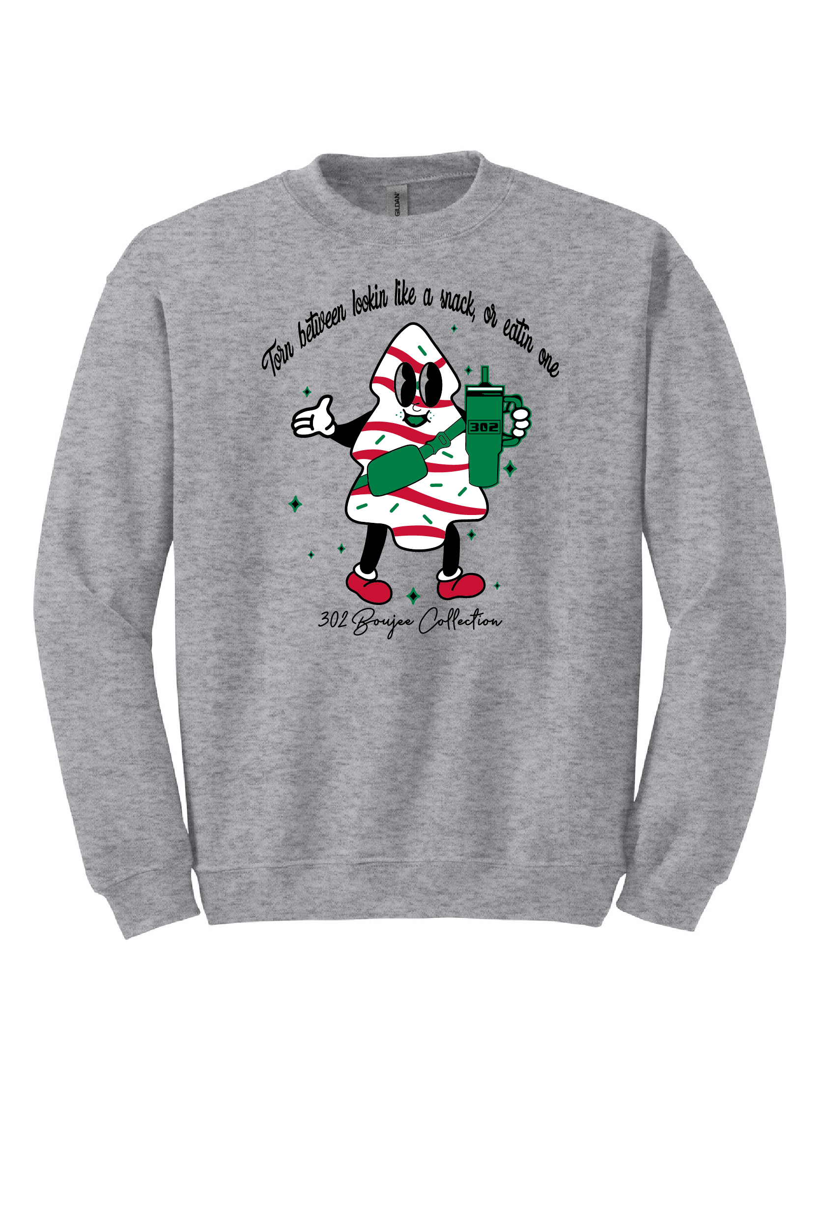 If Christmas snack cakes are your weakness and holiday selfies are your thing, this crewneck is made for you. Featuring a fun, cheeky design that perfectly captures the holiday struggle, the "Torn Between Lookin' Like a Snack or Eatin' One" crewneck is cozy, cute, and packed with personality. Soft, warm, and perfect for cookie swaps, tree decorating, or snacking through your favorite holiday movie marathon.
